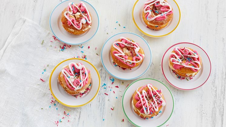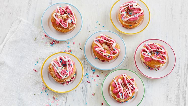 Halkaise donitsit ja täytä ne hieman pehmenneellä jäätelöllä. Koristele donitsit sokerivesikuorrutteella ja nonparelleilla. Laita täytetyt donitsit hetkeksi pakastimeen ennen tarjoilua.