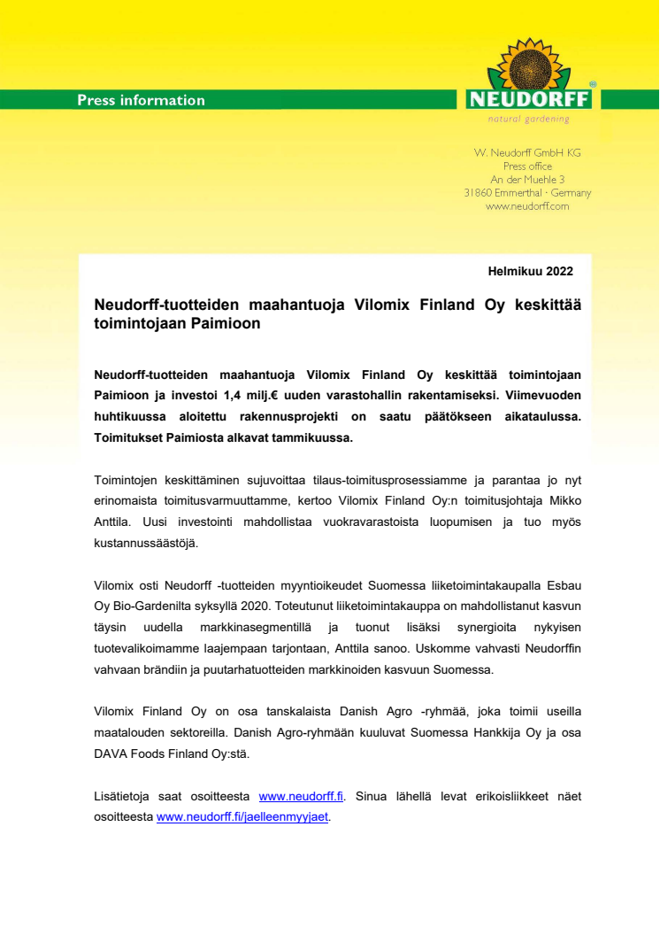 Lehdistötiedote: Neudorff-tuotteiden maahantuoja Vilomix Finland Oy keskittää toimintojaan Paimioon