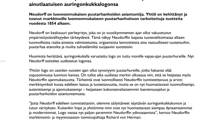 ”Jotta Neudorff edelleen tunnistettaisiin, olemme säilyttäneet näyttävän auringonkukkakuvion ja tutun värityksen. Kuitenkin linjat ja yhtiömme nimi ovat nyt huomattavasti aiempaa dynaamisemmat ja modernimmat. Logo vastaa nyt paljon paremmin Neudorffin ydinosaamista”, kertoo Neudorffin markkinointi- ja myyntiosaston toimitusjohtaja Richard von Herman.