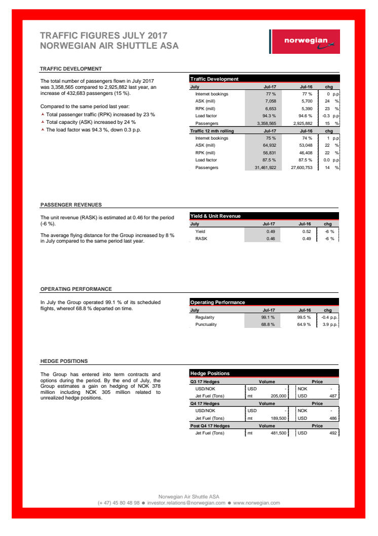 Norwegian marked another milestone in July, as the company carried more than 3.3 million passengers in a single month. The total number of passengers increased by 15 per cent compared to the same month last year. The load factor was 94 per cent.
