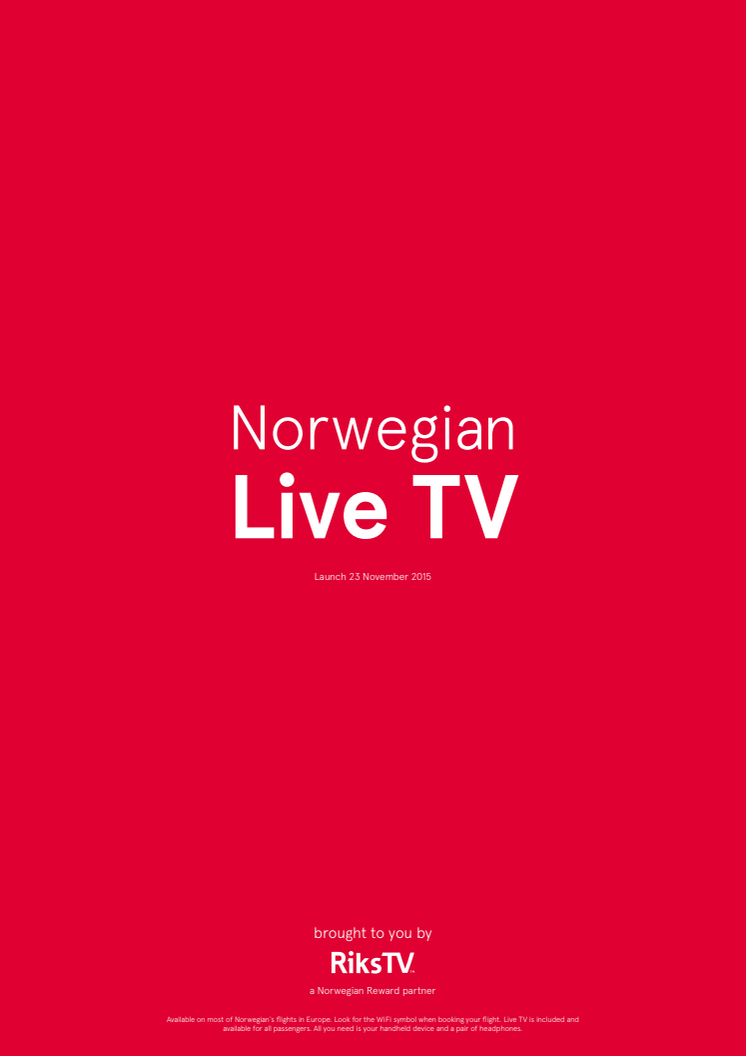 Norwegian lanseeraa tänään ensimmäisenä lentoyhtiönä Euroopassa suorat TV-lähetykset lennoilla. Norjan TV 2:n uutiset ja Bloomberg Televisionin lähetykset näkyvät ilmaiseksi Euroopan lennoilla Norwegianin 87 WiFillä varustetussa lentokoneessa. Matkustajat voivat seurata TV-lähetyksiä omilla tietokoneillaan, tableteillaan ja älypuhelimillaan.