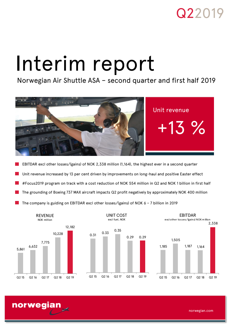 Norwegianin toiselle vuosineljännekselle oli tyypillistä aiempaa alhaisemmat kustannukset ja kasvaneet tuotot – täysin yhtiön strategian mukaisesti. Kasvun hidastumisesta ja Boeing 737 MAX -koneiden ongelmista huolimatta Norwegianin toisen vuosineljänneksen vertailukelpoinen käyttökate oli ennätyskorkea 2,3 miljardia Norjan kruunua.