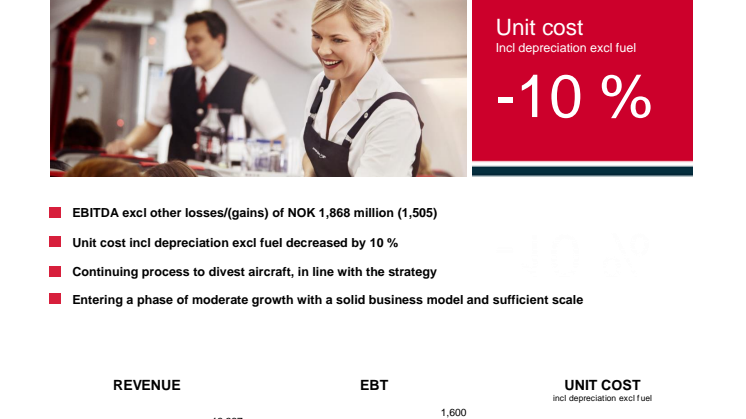 "I am very pleased to present a solid result this quarter with reduced unit cost despite strong growth. Going forward the growth will slow down, and we will begin to reap the large investments we have made over the years, which will benefit customers, employees and shareholders. However, there is no doubt that tough competition, high oil prices and a strong dollar will affect the entire aviation industry, making it even more important to further streamlining our operations and continue to reduce costs," said CEO Bjørn Kjos of Norwegian.