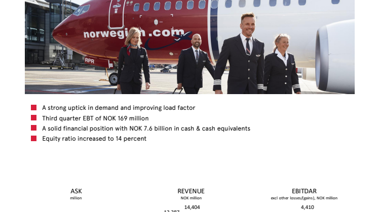 Voitto ennen veroja (EBT) oli 169 miljoonaa Norjan kruunua, kun vastaavana ajanjaksona vuonna 2020 tappio oli 980 miljoonaa Norjan kruunua. Lähes 2,5 miljoonaa matkustajaa matkusti Norwegianilla kolmannella vuosineljänneksellä, kun vastaava luku viime vuonna samaan aikaan oli noin miljoona matkustajaa. Kapasiteetti (ASK) kasvoi 130 prosenttia ja myytyjen henkilökilometrien määrä (RPK) 177 prosenttia verrattuna vuoden 2020 kolmanteen vuosineljännekseen. Käyttöaste oli 73,1 prosenttia, jossa on kasvua 12,5 prosenttiyksikköä. Keskimääräinen matkan pituus kasvoi 20 prosenttia. Kolmannen vuosineljänneksen lopussa yhtiön laivastossa oli 51 lentokonetta.