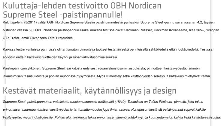 Kuluttaja-lehti (5/2011) valitsi OBH Nordican Supreme Steelin paistinpannutestin parhaaksi. Supreme Steel -pannu sai arvosanan 4,2, täysien pisteiden ollessa 5,0. OBH Nordican paistinpannun lisäksi mukana testissä olivat Hackman Rotisser, Hackman Kovanaama, Ikea 365+, Scanpan CTX, Tefal Jamie Oliver sekä Tefal Preference.