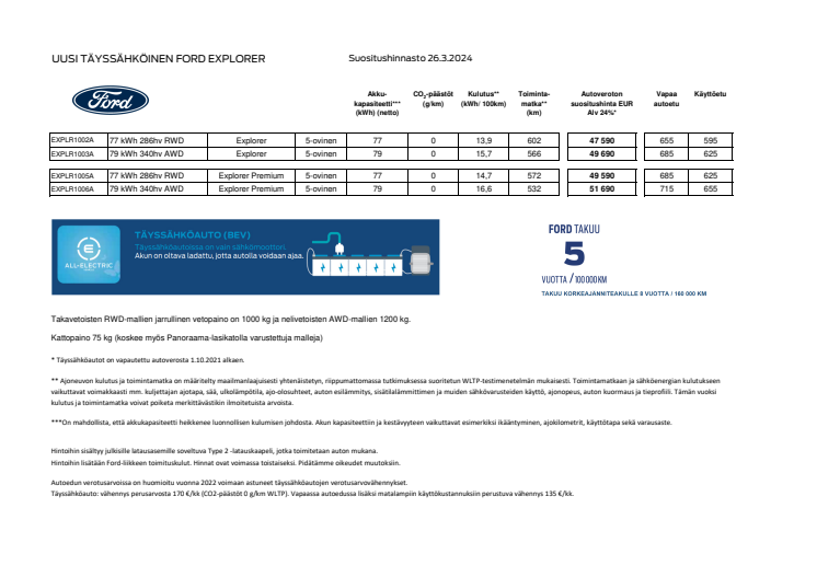 Täyssähköinen Ford Explorer, hinnasto 26.3.2024