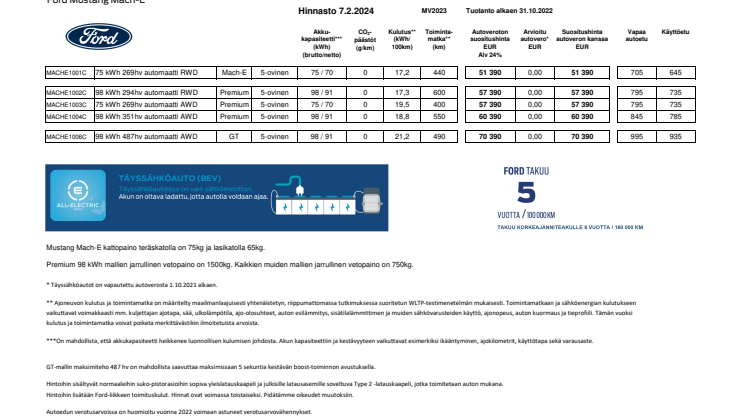 7.2.2024 – Oy Ford Ab on hinnoitellut suositun täyssähköisen Mustang Mach-E -malliston uudelleen. Hintoja on laskettu mallista riippuen 5 600 – 8 600 euroa, ja Mustang Mach-E -malliston hinnat alkavat nyt 51 390 eurosta.