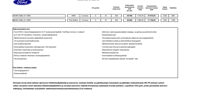 Mustang Mach-E First Edition AWD 98 kWh, hinta alkaen 71.726,03 €.
