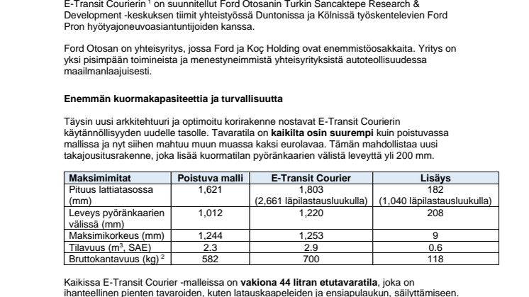 - Uudesta mallista tulevat ensimmäisenä markkinoille polttomoottorimallit; Transit Courierin diesel- ja bensiinimallien tuotanto käynnistyy tämän vuoden aikana ja autot ovat tilattavissa kesällä 2023. Polttomoottorimallien tarkemmat tiedot, Suomen mallisto ja hinnat julkistetaan myöhemmin.