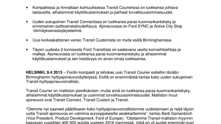 Helsinki, 9.4 2013 – Fordin kompakti ja tehokas uusi Transit Courier esiteltiin Birminghamin hyötyajoneuvonäyttelyssä. Esillä on ensimmäistä kertaa koko uuden sukupolven Transit-hyötyajoneuvomallisto.