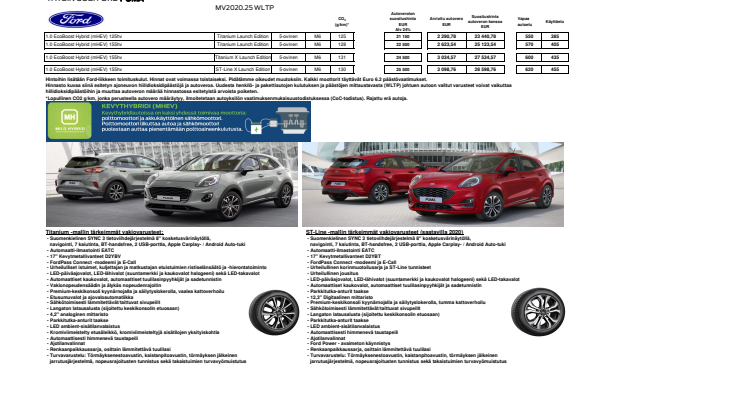 Ford Puma –mallisto CO2-päästöt alkaen 125 g/km, polttoaineen kulutus alk. 5,5 l/100 km*