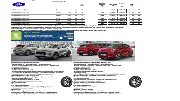 VANTAA, 20.9.2019 – Ford on julkaissut ensi vuoden alkupuolella Suomeen tulevan täysin uuden Ford Puman hinnat ja samalla auton ennakkomyynti on käynnistynyt. Ensimmäisenä Suomen markkinoille tulevat manuaalivaihteiset Ford Puma EcoBoost Hybrid Launch Edition –kevythybridimallit 125 hv ja 155 hv moottoreilla.