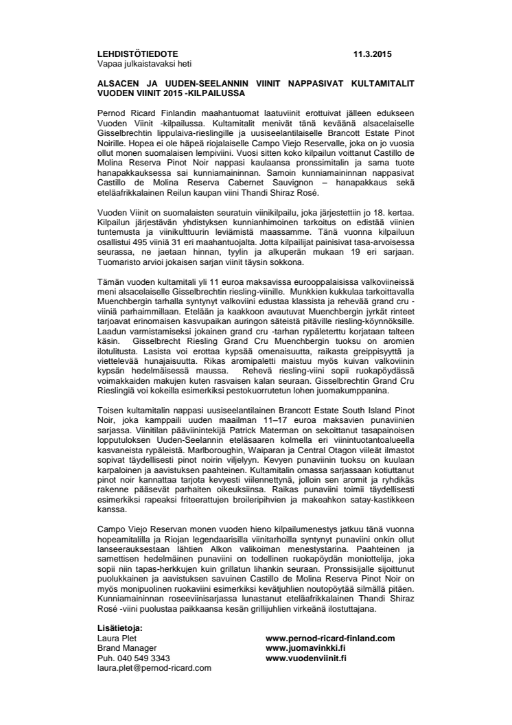 Pernod Ricard Finlandin maahantuomat laatuviinit erottuivat jälleen edukseen Vuoden Viinit -kilpailussa. Kultamitalit menivät tänä keväänä alsacelaiselle Gisselbrechtin lippulaiva-rieslingille ja uusiseelantilaiselle Brancott Estaten Pinot Noirille. Muutakin kunniaa tuli runsaasti.
