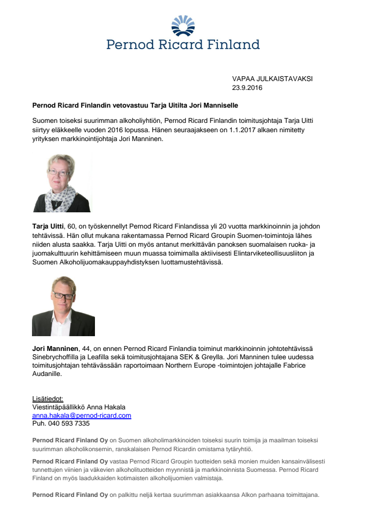 Pernod Ricard Finlandin vetovastuu Tarja Uitilta Jori Manniselle