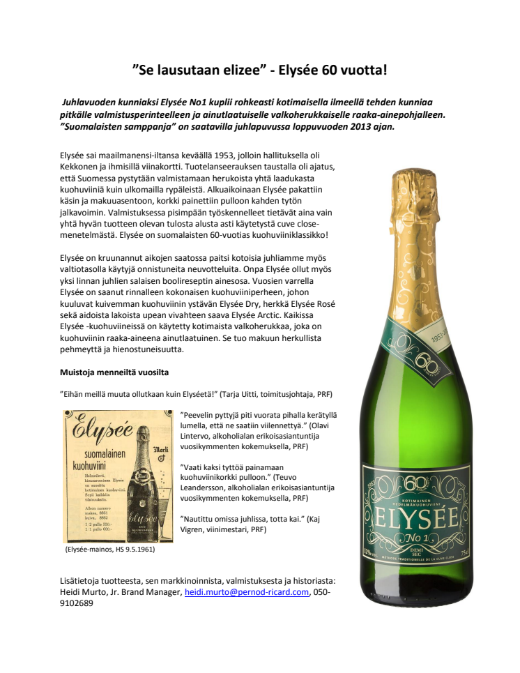 Juhlavuoden kunniaksi Elysée No1 kuplii rohkeasti kotimaisella ilmeellä tehden kunniaa pitkälle valmistusperinteelleen ja ainutlaatuiselle valkoherukkaiselle raaka-ainepohjalleen. ”Suomalaisten samppanja” on saatavilla juhlapuvussa loppuvuoden 2013 ajan.