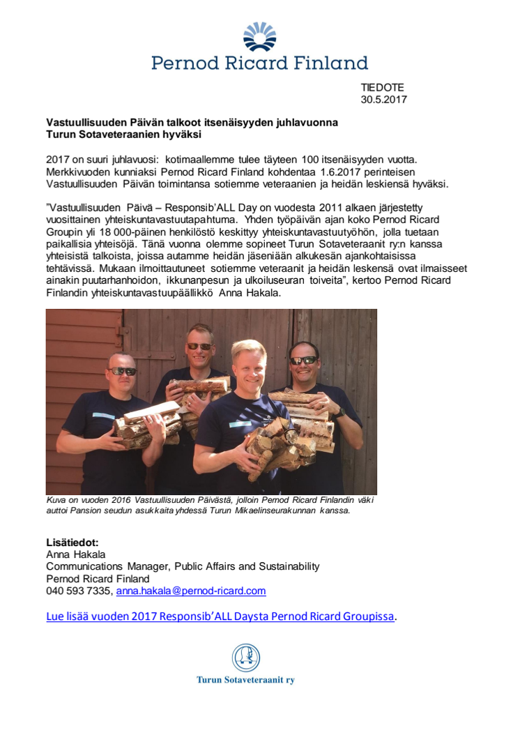 Suomen 100-vuotisjuhlan kunniaksi Pernod Ricard Finland kohdentaa 2017 Vastuullisuuden Päivän toimintansa Turun Sotaveteraanien hyväksi.
