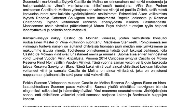 Kansainvälisyys näkyy Castillo de Molinan viineissä, joiden valmistusta konsultoi ruotsalainen Master of Wine -tutkinnon suorittanut Madeleine Stenwreth. Pohjoismaalaisen viinimaun tunteva nainen on auttanut chileläisiä luomaan juuri meidän mieltymyksiimme ja makuumme istuvia viinejä. Todisteena onnistuneesta työstä ovat lukuisat palkinnot, joita Castillo de Molinan viinit ovat lunastaneet meillä ja muualla. Suomalaisia eniten kiinnostavat voitot tulevat Vuoden Viinit -kilpailusta. Vuonna 2014 Curicóssa syntyvä Castillo de Molina Reserva Pinot Noir valittiin Vuoden Viiniksi. Tänä vuonna saman voiton vei Elquin laaksosta tuleva Reserva Sauvignon Blanc.Nämä kaksi viiniä ovat ainoat chileläiset koskaan kilpailun voittaneet viinit ja samalla Castillo de Molina on ainoa viinibrändi, joka on onnistunut nappaamaan platinamitalin sekä puna- että valkoviinillä.