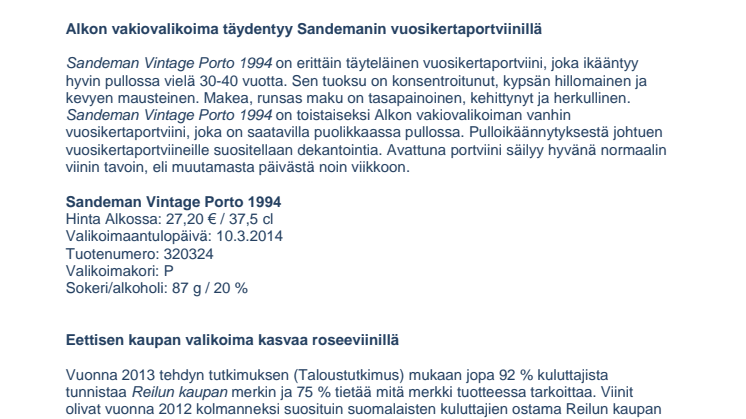 Alkon valikoima täydentyy maalis-toukokuussa kolmella varsin erityyppisellä ja mielenkiintoisella viiniuutuudella. Maaliskuussa listautuva Sandeman Vintage Porto 1994 on viininystävien iloksi saatavilla puolikkaassa pullossa. Huhtikuun puolivälissä roseeviinivalikoima täydentyy eteläafrikkalaisella Thandi Shiraz Rosé 2013 Reilun kaupan viinillä. Toukokuun lopussa hyllyille nostetaan yli satavuotiaiden Cabernet Sauvignon -köynnösten rypäleistä valmistettu Santa Helena 100+ Parras Viejas.
