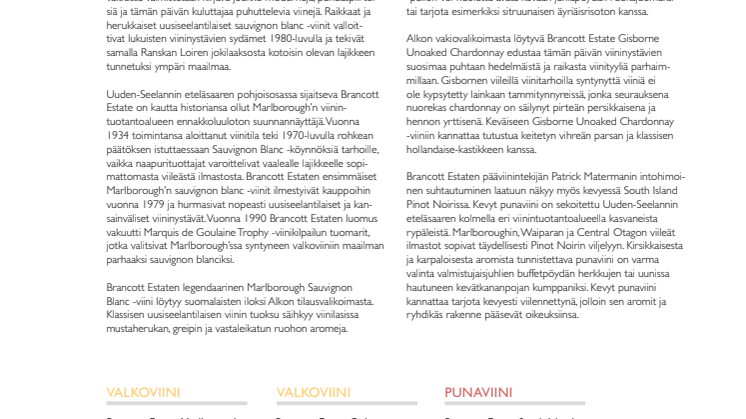 vakuutti Marquis de Goulaine Trophy -viinikilpailun tuomarit, jotka valitsivat Marlborough’ssa syntyneen valkoviiniin maailman parhaaksi sauvignon blanciksi. Brancott Estaten legendaarinen Marlborough Sauvignon Blanc -viini löytyy suomalaisten iloksi Alkon tilausvalikoimasta. Klassisen uusiseelantilaisen viinin tuoksu säihkyy viinilasissamustaherukan, greipin ja vastaleikatun ruohon aromeja.