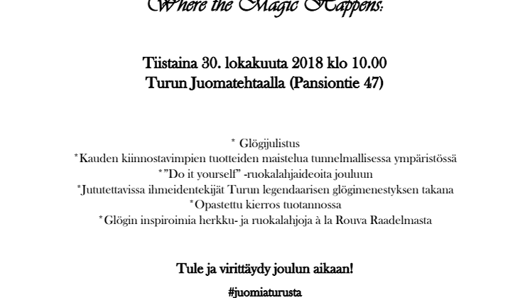 Glögikausi 2018 julistetaan avatuksi 30. lokakuuta klo 10 Turun juomatehtaalla. Lehdistön edustajat ovat tervetulleita tilaisuuteen.