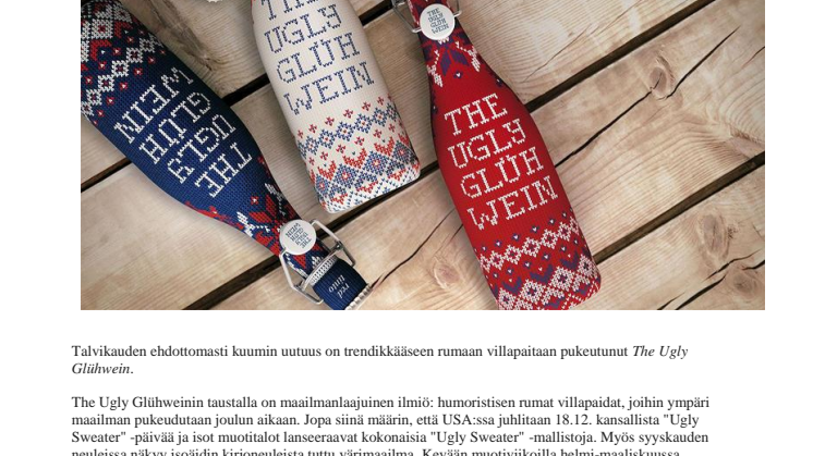 Espanjalainen nuorten yrittäjien Barcelona Brands tarttui ilmiöön ja loi Tempranillo-rypäleistä erittäin laadukkaan glühweinin, jonka hedelmäinen, mausteinen ja glögimäisen makeahko makumaailma sopii suomalaiseen makuun kuin punainen nenä Petteri-porolle. Omassa rumassa villapaidassaan The Ugly Glühwein erottuu joukosta ja sulautuu juhlijoiden tyyliin kotona. The Ugly Glühwein on makeampi kuin glühweinit yleensä. Juoman voi kuumentaa tai nauttia sellaisenaan.