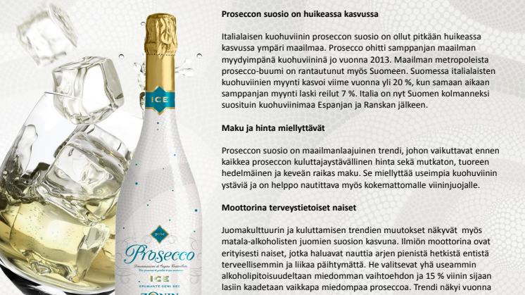 Italialaisen kuohuviinin proseccon suosio on ollut pitkään huikeassa kasvussa ympäri maailmaa. Prosecco ohitti samppanjan maailman myydyimpänä kuohuviininä jo vuonna 2013. Maailman metropoleista prosecco-buumi on rantautunut myös Suomeen. Suomessa italialaisten kuohuviinien myynti kasvoi viime vuonna yli 20 %, kun samaan aikaan samppanjan myynti laski reilut 7 %. Italia on tällä hetkellä Suomen kolmanneksi suosituin kuohuviinimaa Espanjan ja Ranskan jälkeen.