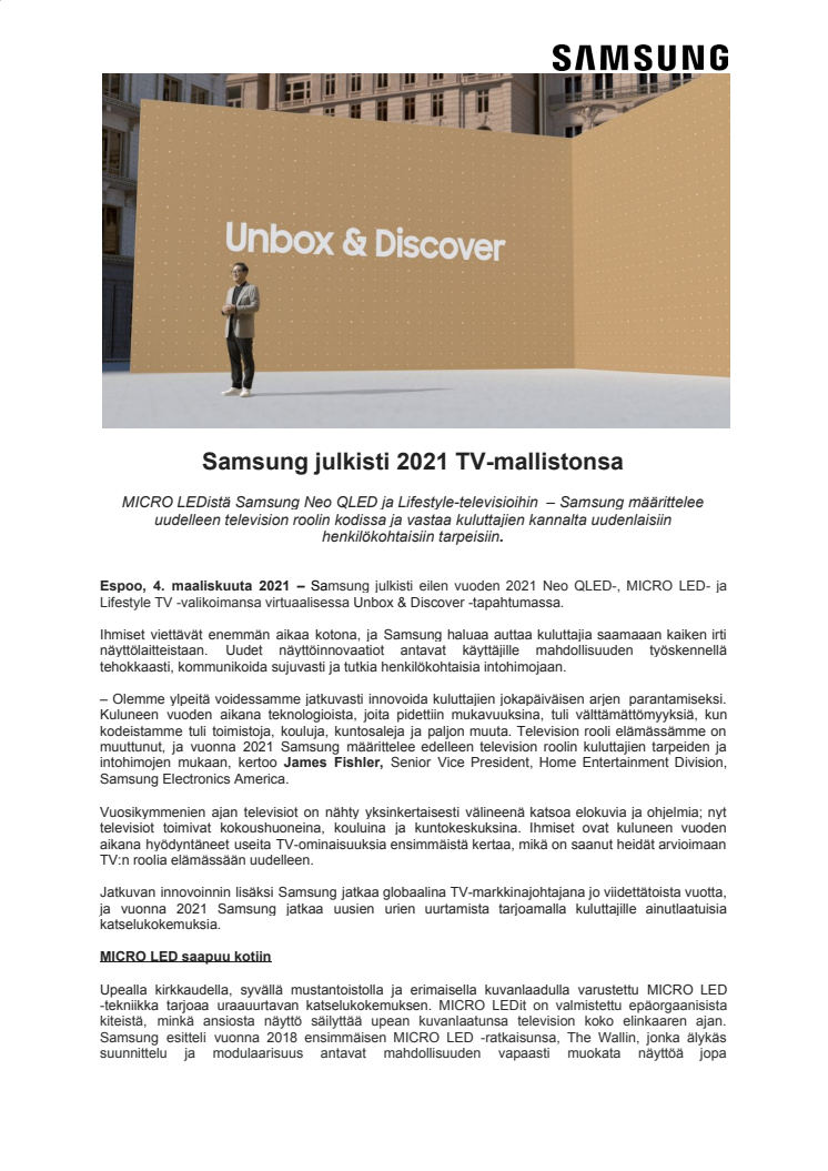 MICRO LEDistä Samsung Neo QLED ja Lifestyle-televisioihin – Samsung määrittelee uudelleen television roolin kodissa ja vastaa kuluttajien kannalta uudenlaisiin henkilökohtaisiin tarpeisiin.