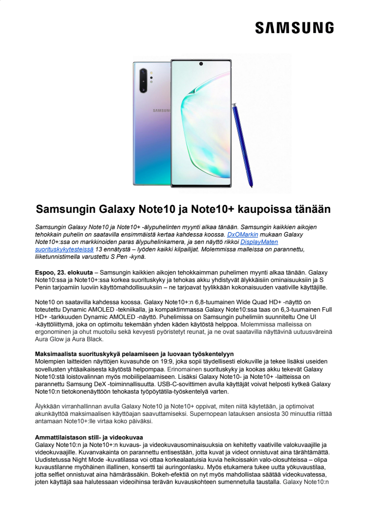 Samsungin Galaxy Note10 ja Note10+ -älypuhelinten myynti alkaa tänään. Samsungin kaikkien aikojen tehokkain puhelin on saatavilla ensimmäistä kertaa kahdessa koossa. DxOMarkin mukaan Galaxy Note10+:ssa on markkinoiden paras älypuhelinkamera, ja sen näyttö rikkoi DisplayMaten suorituskykytesteissä 13 ennätystä – lyöden kaikki kilpailijat.