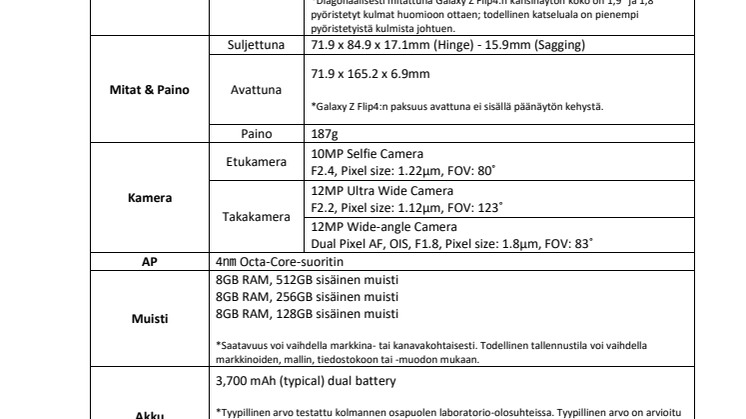 [6] Verrattuna Galaxy Z Flip3 5G:hen. Tyypillinen arvo testattu kolmannen osapuolen laboratorio-olosuhteissa. Tyypillinen arvo on arvioitu keskiarvo, joka ottaa huomioon akun kapasiteetin poikkeaman IEC 61960 -standardin mukaisesti testattujen akkunäytteiden välillä. Nimellinen (minimi)kapasiteetti on 3 595 mAh. Todellinen akun käyttöikä voi vaihdella verkkoympäristön, käyttötapojen ja muiden tekijöiden mukaan.