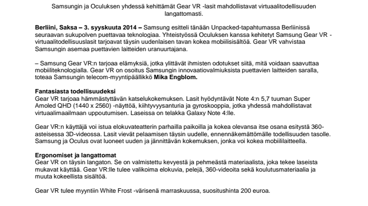 Berliini, Saksa – 3. syyskuuta 2014 – Samsung esitteli tänään Unpacked-tapahtumassa Berliinissä seuraavan sukupolven puettavaa teknologiaa. Yhteistyössä Oculuksen kanssa kehitetyt Samsung Gear VR -virtuaalitodellisuuslasit tarjoavat täysin uudenlaisen tavan kokea mobiilisisältöä. Gear VR vahvistaa Samsungin asemaa puettavien laitteiden uranuurtajana.