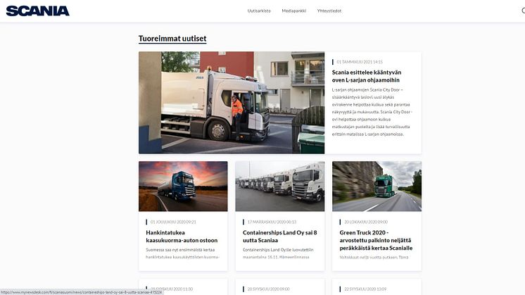 Scania Suomen uusi uutishuone on toteutettu Mynewsdesk Ab:n palveluiden avulla. Seuraamalla uutishuonetta uudet julkaisut saapuvat automaattisesti uutishuoneen seuraajille.