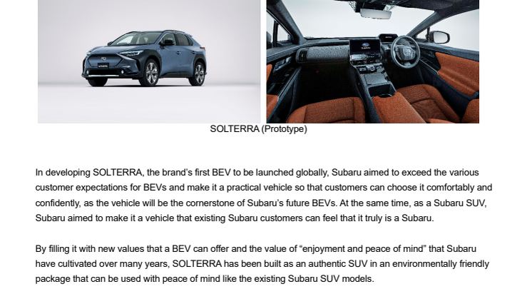 SOLTERRA is the vehicle which takes an important role for SUBARU, the company aiming at “delivering happiness to all,” to face the challenges of global warming and climate change and continue to deliver smiles in the future.