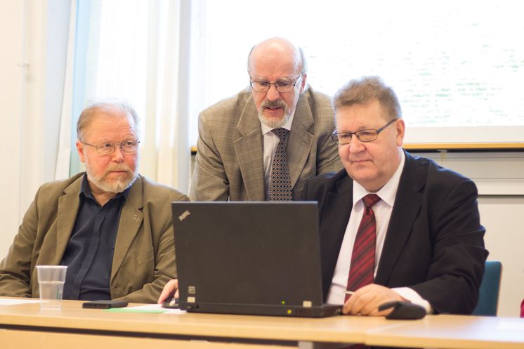Edessä Seppo Brandt ja Reijo Perkiömäki järjestötyön pääpalkinton saaneesta Lohjan Sydämestä takana Rauno Pohjonen Kirkkonummen-Siuntion Sydänyhdistyksestä