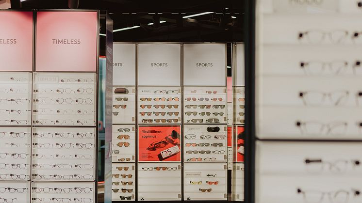 Synsamin uudessa myymälässä on tarjolla uusien silmälasikehyksien lisäksi myös kierrätysmateriaaleista tehtyjä kehyksiä. Synsamin teettämän valtakunnallisen kuluttajatutkimuksen mukaan huoli ilmastonmuutoksesta on saanut suomalaiset arvostamaan kierrätystä.