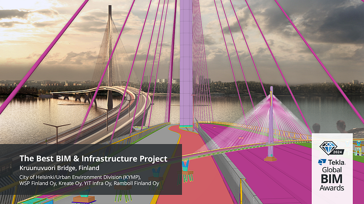 WESTMINSTER, Colo, 2. lokakuuta 2024 - Trimble (Nasdaq: TRMB) julkisti tänään vuoden 2024 Tekla® Global BIM -kilpailun voittajat. Tässä kahden vuoden välein järjestettävässä kilpailussa arvioidaan maailman vaikuttavimpia Tekla-ohjelmistoilla suunniteltuja rakennushankkeita kahdeksassa kategoriassa. Tuomariston kriteerit ovat muunmuassa seuraavat: tietomallien käyttö sekä yhteistyö eri osapuolien välillä, Tekla-ohjelmiston innovatiivinen käyttö, rakennettavuus, ympäristön huomioonottaminen ja muut vaikuttavuustekijät. Vuoden 2024 parhaaksi BIM-projektiksi valittiin Kruunuvuorensilta Helsingissä, joka on ollut BIM-projekti hankkeen alusta loppuun asti.