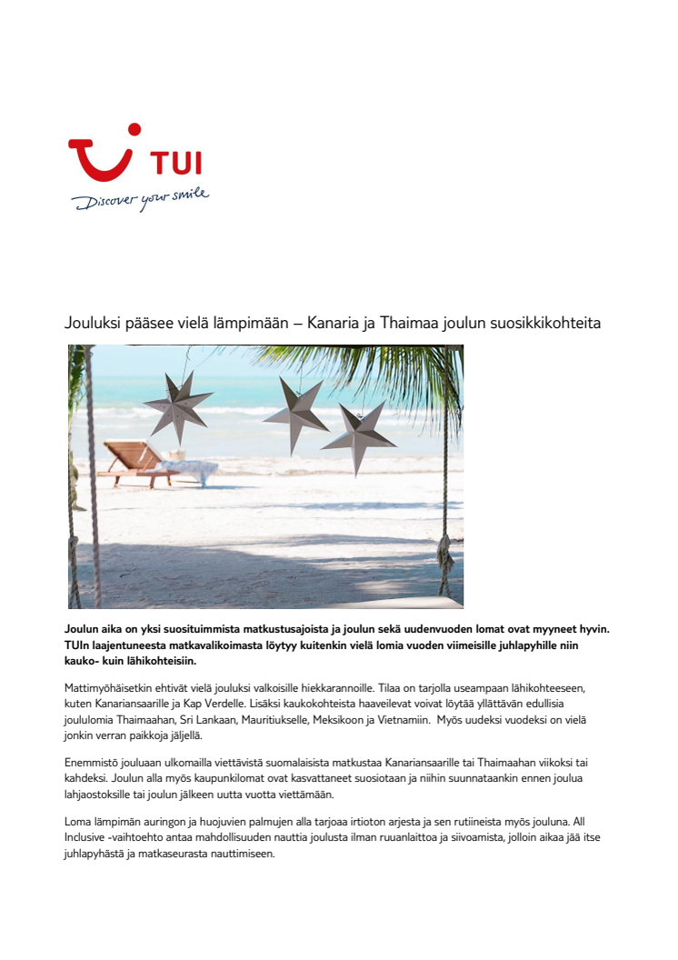 Joulun aika on yksi suosituimmista matkustusajoista ja joulun sekä uudenvuoden lomat ovat myyneet hyvin. TUIn laajentuneesta matkavalikoimasta löytyy kuitenkin vielä lomia vuoden viimeisille juhlapyhille niin kauko- kuin lähikohteisiin.