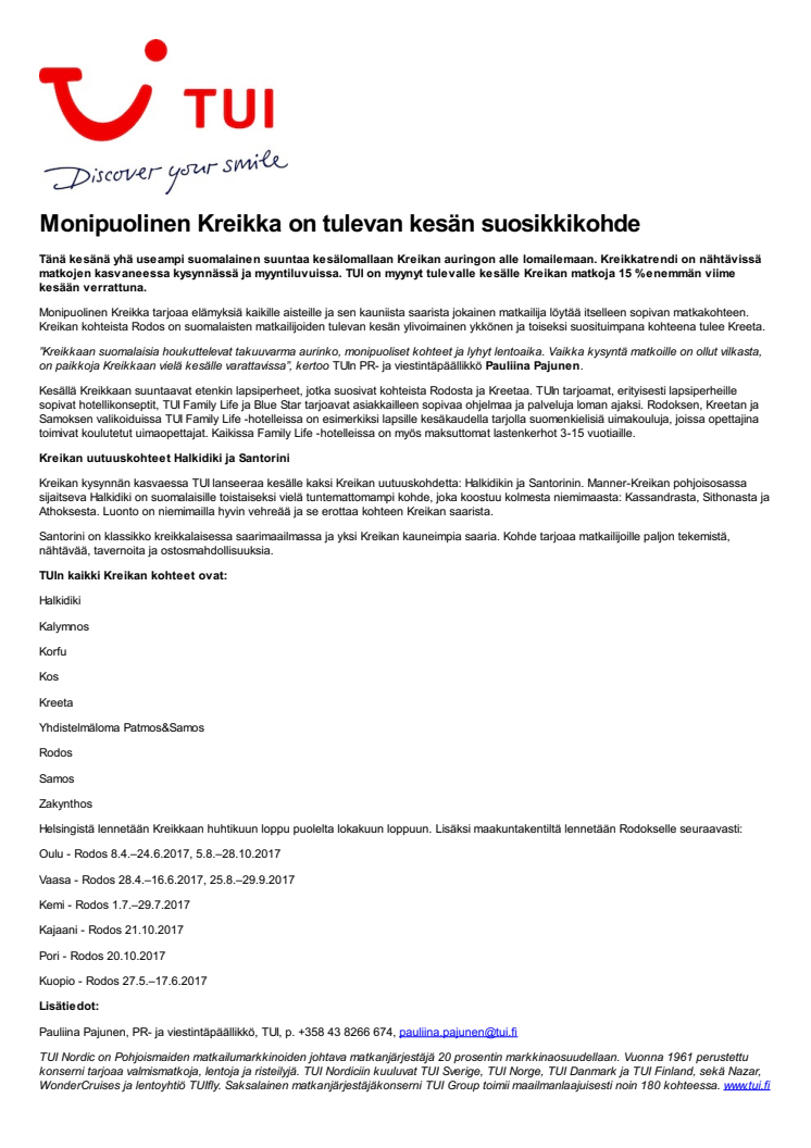 Tänä kesänä yhä useampi suomalainen suuntaa kesälomallaan Kreikan auringon alle lomailemaan. Kreikkatrendi on nähtävissä matkojen kasvaneessa kysynnässä ja myyntiluvuissa. TUI on myynyt tulevalle kesälle Kreikan matkoja 15 % enemmän viime kesään verrattuna.