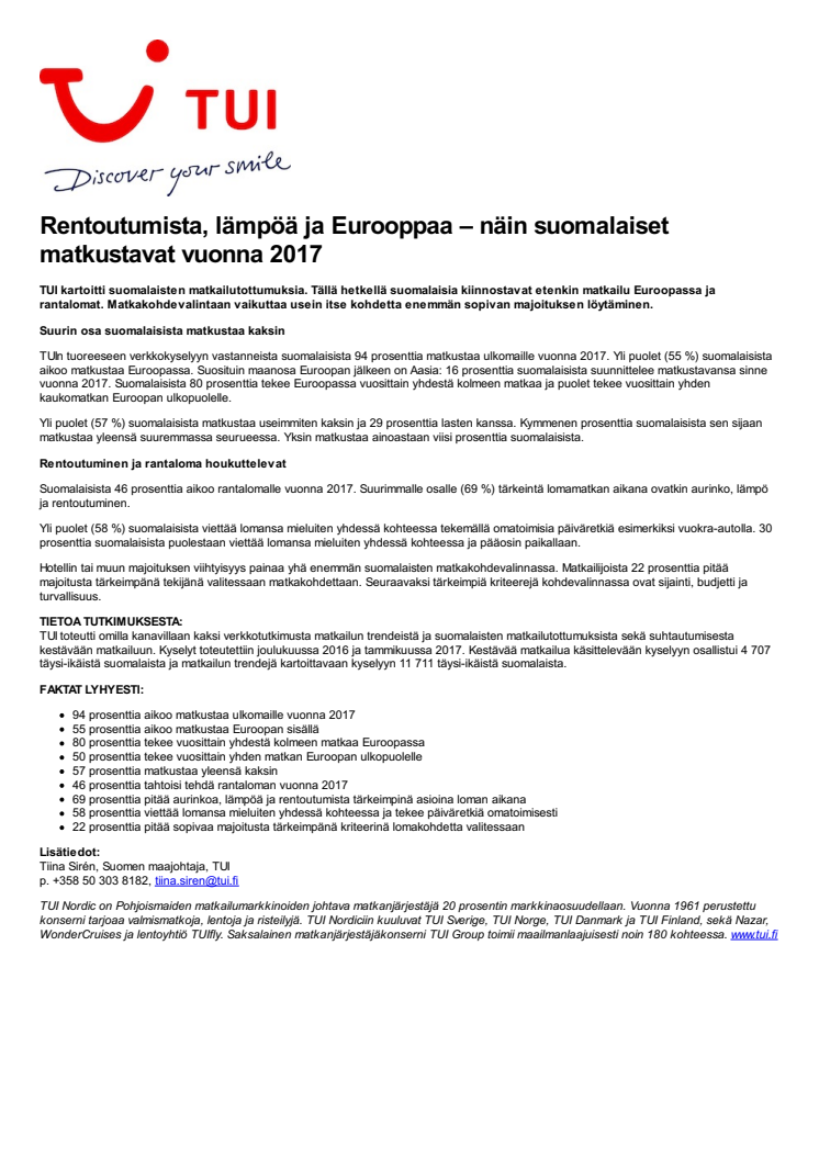 TUI kartoitti suomalaisten matkailutottumuksia. Tällä hetkellä suomalaisia kiinnostavat etenkin matkailu Euroopassa ja rantalomat. Matkakohdevalintaan vaikuttaa usein itse kohdetta enemmän sopivan majoituksen löytäminen.