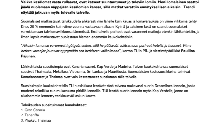 Suomalaiset matkustavat talvikaudella ahkerasti niin lähelle kuin kauas ja lomavarauksia on viime viikkoina tehty lähes 20 % enemmän kuin viime vuonna vastaavaan aikaan. Kylmä ja sateinen kesä on saanut suomalaiset varmistamaan talvilomaviikkonsa lämmössä. Ensi talvelle perheet ovat varanneet matkoja etenkin lähikohteisiin, ja ilman lapsia matkustavat puolestaan hieman enemmän kaukokohteisiin.