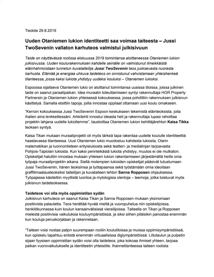 Taide on näyttävässä roolissa elokuussa 2019 toimintansa aloittaneen Otaniemen lukion julkisivussa. Uuden koulurakennuksen kahdelle seinälle on valmistunut ilmeikkäistä eläinhahmoistaan tunnetun kuvataiteilija Jussi TwoSevenin teos juoksevasta nuoresta karhusta.