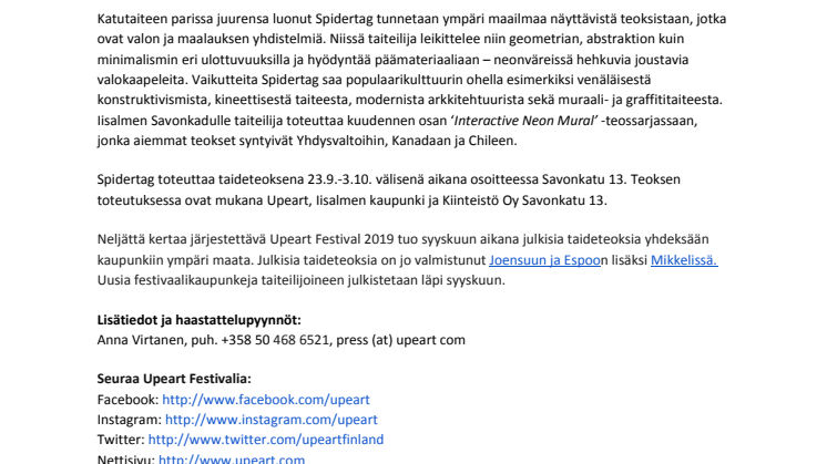 Iisalmeen syntyy tänä syksynä uniikki interaktiivinen taideteos kaikille yhteiseen kaupunkitilaan. Espanjalainen taiteilija Spidertag toteuttaa näyttävän valotekniikkaa hyödyntävän teoksensa ‘Interactive Neon Mural #6’ osana valtakunnallista Upeart Festival 2019 -tapahtumaa. Suomen suurin julkisen tilan taidetapahtuma tuo syksyn aikana toistakymmentä pysyvää julkisen taiteen teosta yhdeksään kaupunkiin ympäri maata.