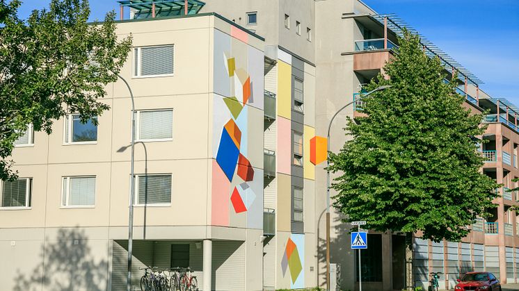 Kuvataiteilija Tuomas Korkalon abstrakti seinämaalaus tuo väriä ja liikkeen tuntua Joensuun keskustan eläväiseen opiskelija-asuntokortteliin