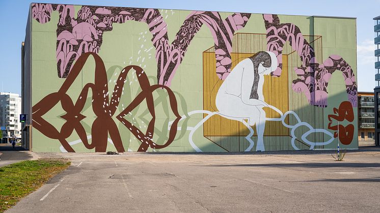 Lahden Ranta-Kartanon uusi taideteos "Rantavesien haaveilija" tuo leikkisyyttä kookkaan parkkitalon julkisivuun