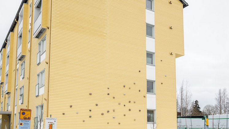 Puukerrostalokortteliin toteutettu taideteos on ensimmäinen osa Lahden Svinhufvudinkadulle valmistuvasta veistossarjasta