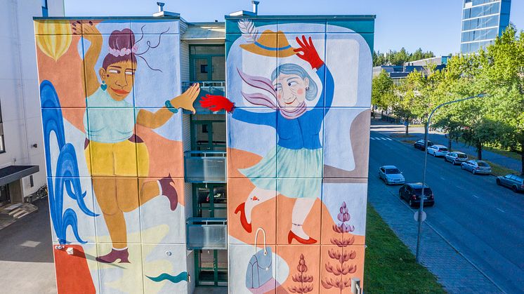 Taiteilija Laura Lehtisen vaikuttavan kokoinen seinämaalaus juhlistaa elämäniloa ja ystävyyttä Joensuun keskustassa