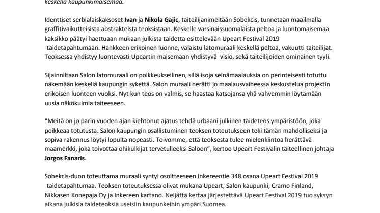 Varsinaissuomalaista peltomaisemaa värittää nyt poikkeuksellinen julkinen taideteos, kun Sobekcis-taiteilijakaksikon kokonaisen ladon kattavan muraali valmistui Inkereentielle osana Upeart Festival 2019 -tapahtumaa. Kaikilta sivuiltaan maalattu lato sai ylleen voimakkaita värejä, liikettä ja abstrakteja muotoja kantavan teoksen, joka valaistaan pysyvästi uusiutuvan energian sähköllä. Salon latomuraali haastaa sijainnillaan urbaanin julkisen taiteen perinteitä, jossa teoksia on totuttu näkemään keskellä kaupunkimaisemaa.