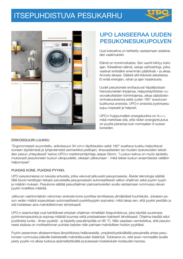 UPO:n asiantuntijat ovat kehittäneet erityisen ohjelman nimeltään Itsepuhdistuva, joka käyttää suurempia pyörimisnopeuksia ja sopivaa määrää kuumaa vettä poistaakseen bakteerit tehokkaasti. Itsepuhdistuva-ohjelman ansiosta käytössäsi on puhdas pesukone ilman bakteereita ja epämiellyttäviä hajuja ja voit myös pestä pyykkisi alhaisemmissa lämpötiloissa, esim. 15 tai 30 °C:ssa.