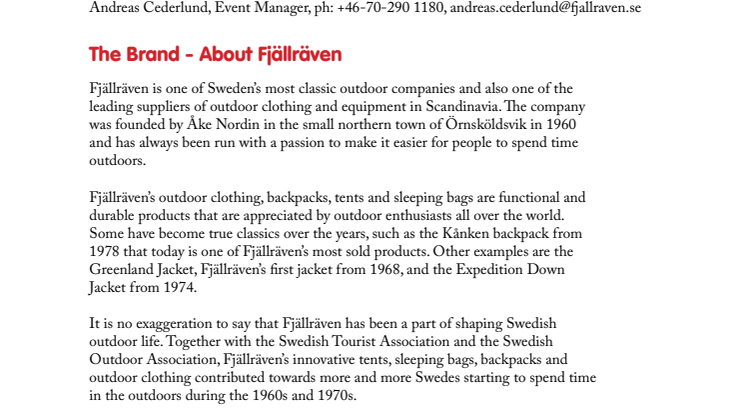 Fjällräven prioritises acting responsibly towards people, animals and nature and encouraging and sustaining public interest in the outdoors. The company is the initiator of two popular outdoor events, Fjällräven Classic and Fjällräven Polar, which attract thousands of participants every year. Fjällräven is a part of the Fenix Outdoor Group. The Group's net sales totalled MSEK 1 865,8 in 2013.