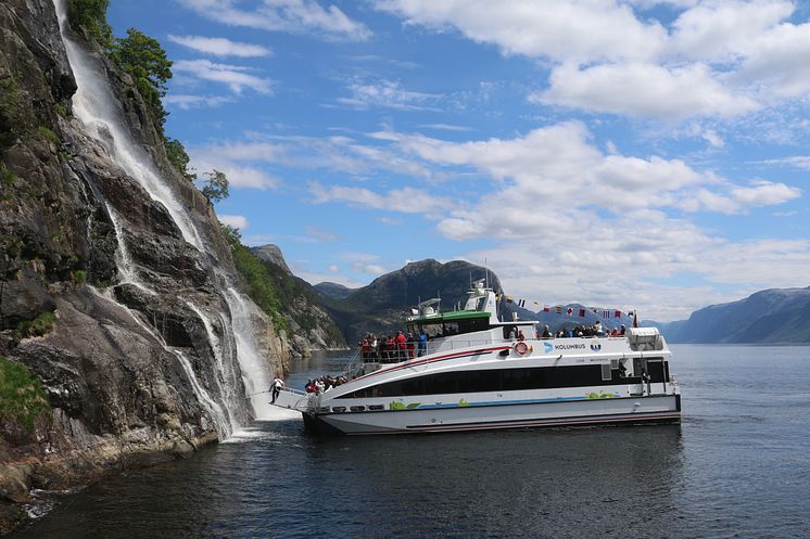Hengjanefossen can be seen from deck on a fjord cruise in the Lysefjorden. Photo: Helgøy Skyssbåt.