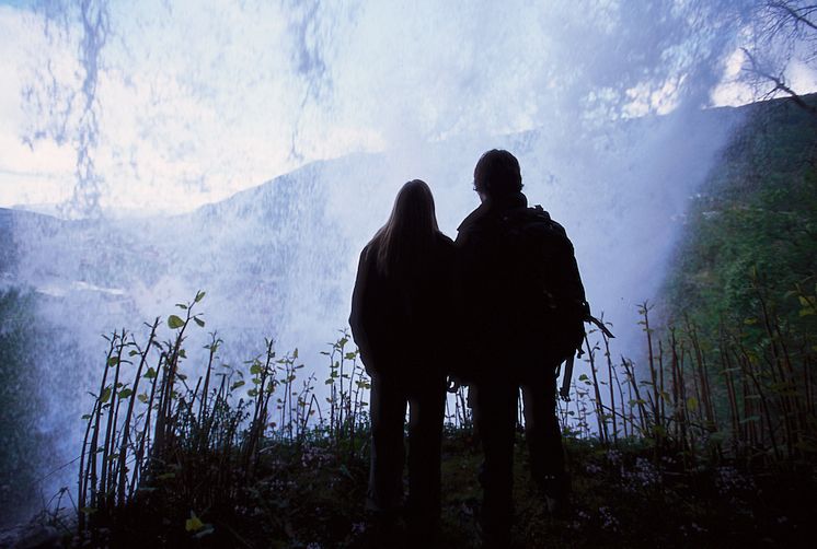A couple behind the Steinsdalsfossen waterfall in Hardangerfjord. Photo: Terje Rakke / Nordic Life AS